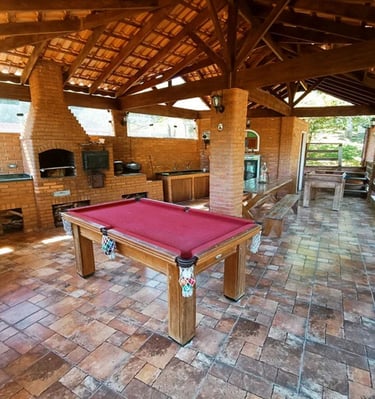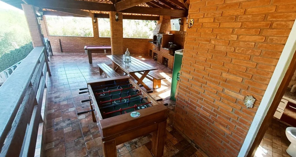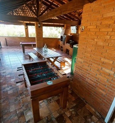 Espaçosa varanda para eventos, equipada com mesa de pebolim e sinuca.
